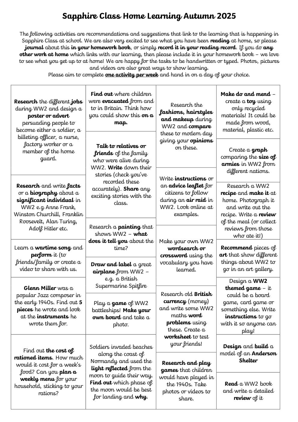 Topic Grid - this provides children with a range of activities that span different learning techniques and different areas of the curriculum. These are linked with our topic. Children should aim to complete one a week and bring this in when it is done. We understand that busy lives mean that children in one class cannot all complete homework on the same day, so this should give some flexibility to suit your family as to when it is handed in.