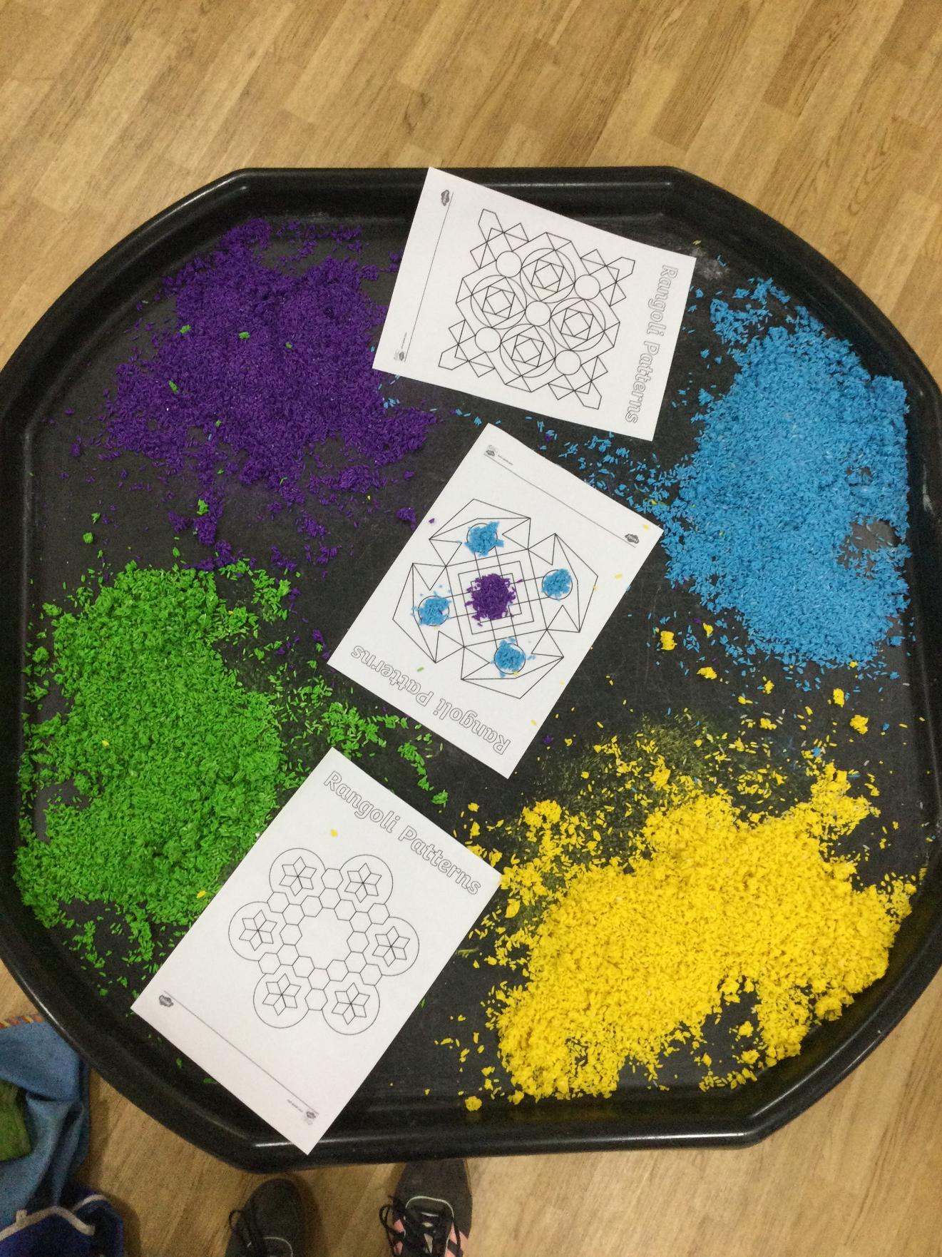 Resources ready for Rubies to make their own rangoli patterns. This was one of the activties they engaged in when learning about Diwali.